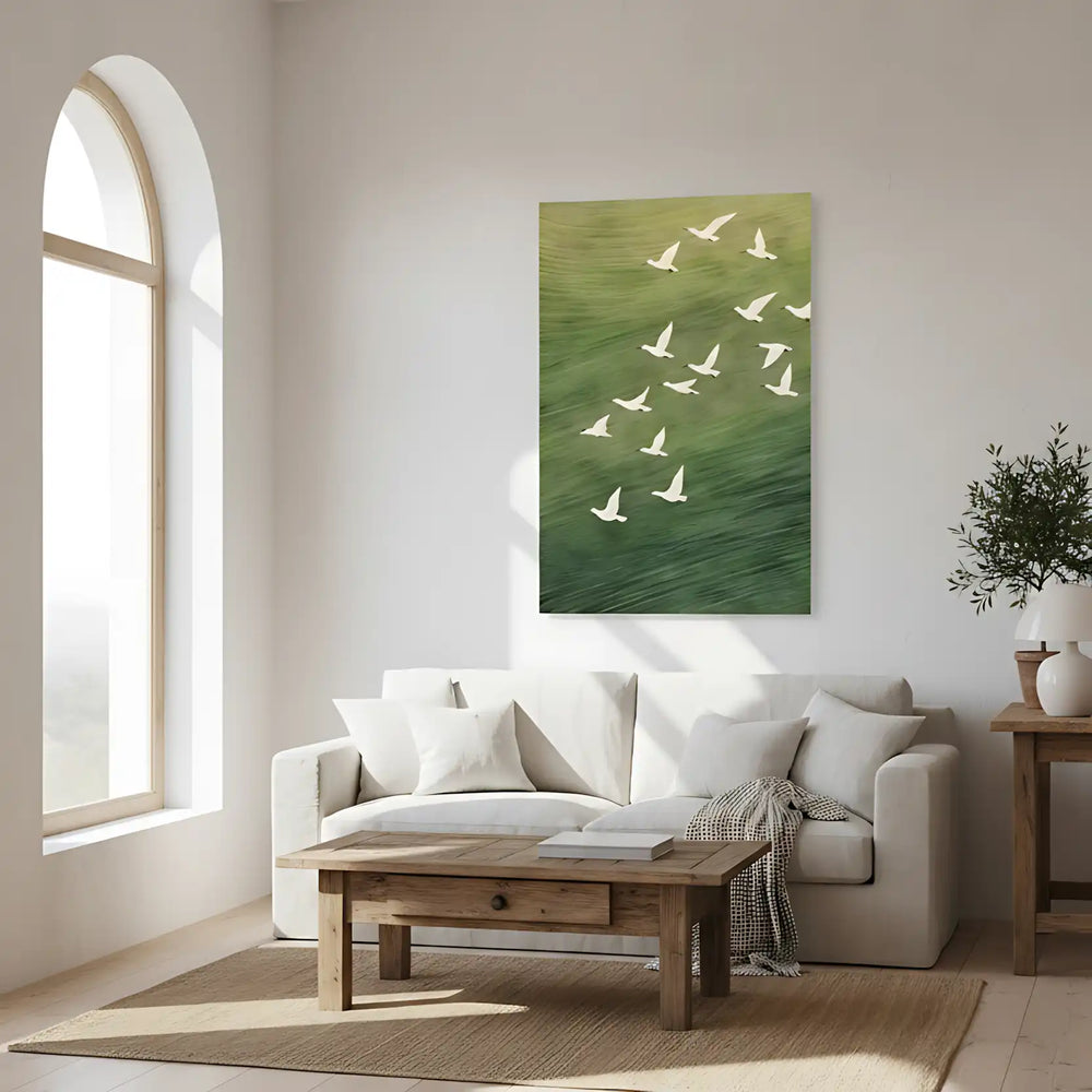 Oiseaux blancs en vol sur fond vert apaisant, évoquant liberté et sérénité, idéal pour salon ou bureau.