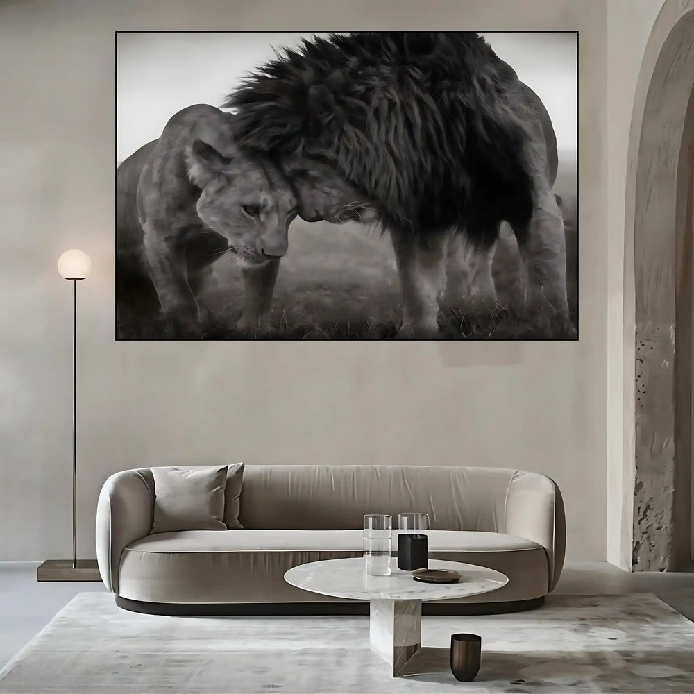 Lion et lionne en noir et blanc, moment de tendresse, ambiance sereine pour salon ou bureau.