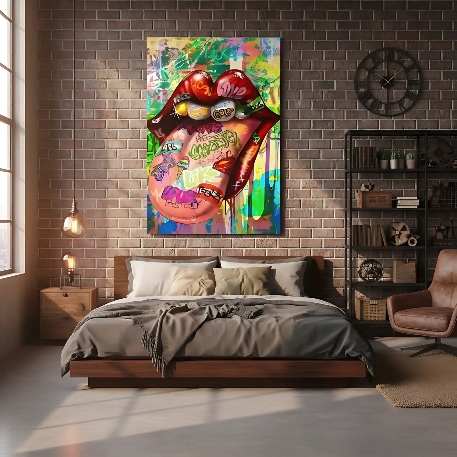 Tableau pop art avec bouche rouge vif et graffitis multicolores, ambiance urbaine et dynamique pour salon moderne.