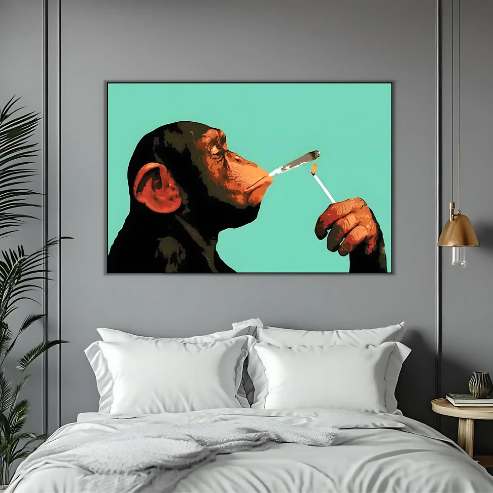 Tableau pop art d'un chimpanzé fumant, couleurs vives et style moderne, ambiance humoristique pour salon ou bureau.