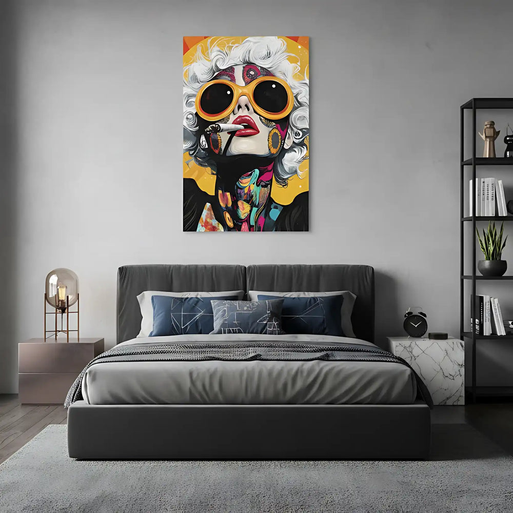 Portrait pop art d'une femme aux cheveux blancs, lunettes orange, motifs floraux et couleurs vives, ambiance énergique.
