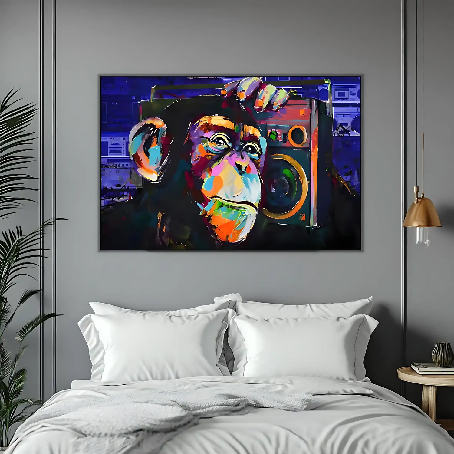 Tableau pop art avec singe vibrant et radio, couleurs éclatantes, ambiance ludique pour salon moderne.