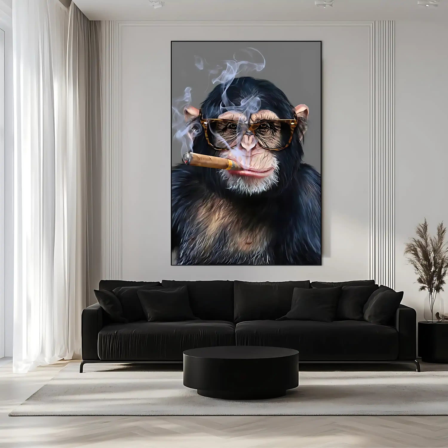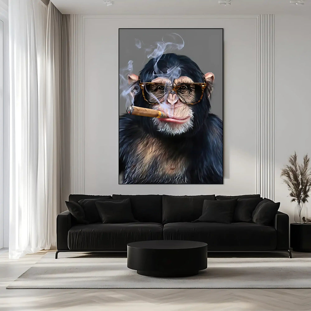 Portrait d'un singe avec lunettes fumant un cigare, ambiance chic et mystique, idéal pour salon ou bureau moderne.