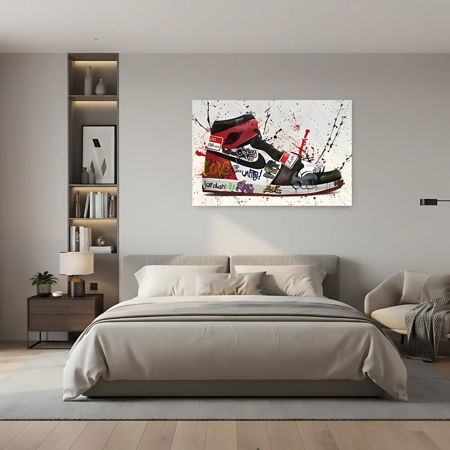 Chaussure ornée de graffitis multicolores, éclaboussures rouges et noires, énergie urbaine pour salon moderne ou bureau créat