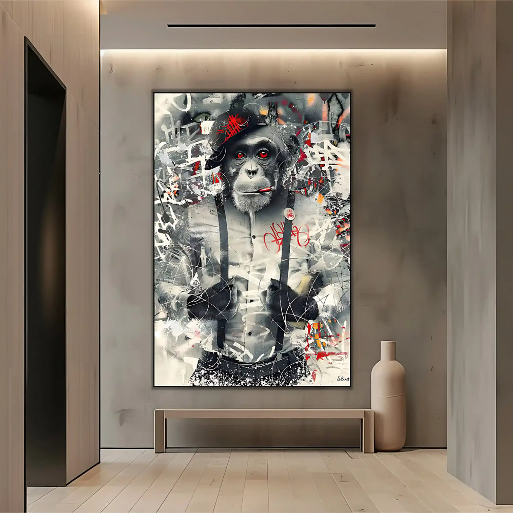 🎯 Cette pièce stimule la créativité et l'inspiration tout en soutenant l'ambition professionnelle. L'humanisation du primate en tenue formelle questionne les codes sociaux avec une ironie subtile et moderne.