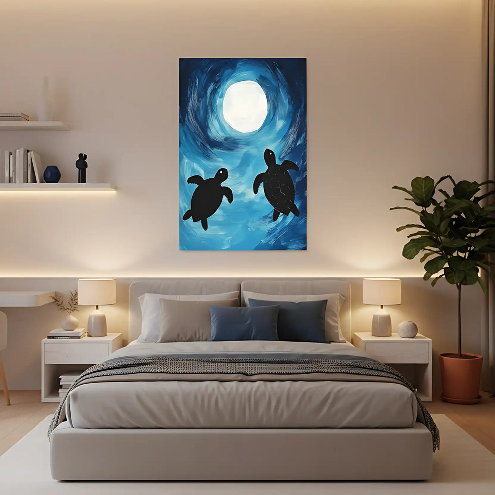 Peinture de deux tortues nageant sous la lumière de la lune, avec un fond bleu vibrant, idéale pour une chambre ou salon moderne.