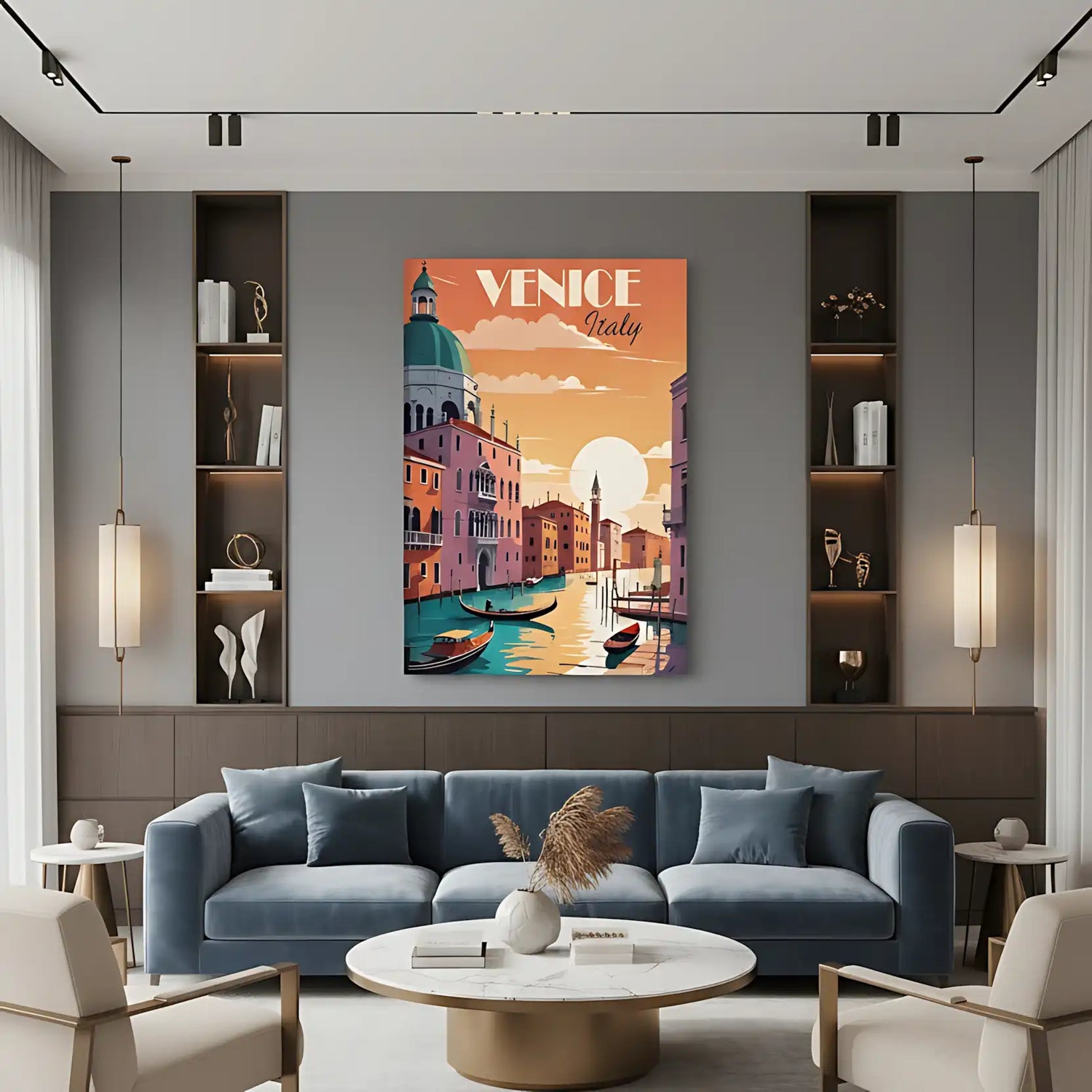 🎨 Cette illustration vintage capture la magie éternelle de Venise au coucher du soleil, où les gondoles glissent silencieusement sur les canaux dorés. Les couleurs chaudes orange et turquoise créent une atmosphère romantique inoubliable.