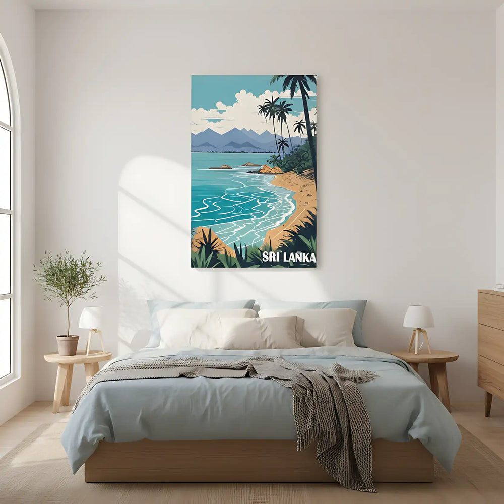 🎨 Cette affiche vintage de voyage capture la beauté intemporelle d'une plage paradisiaque sri-lankaise. Les palmiers élégants se dressent majestueusement contre un ciel turquoise lumineux, créant une composition parfaitement équilibrée dans le plus pur style rétro des années 50.