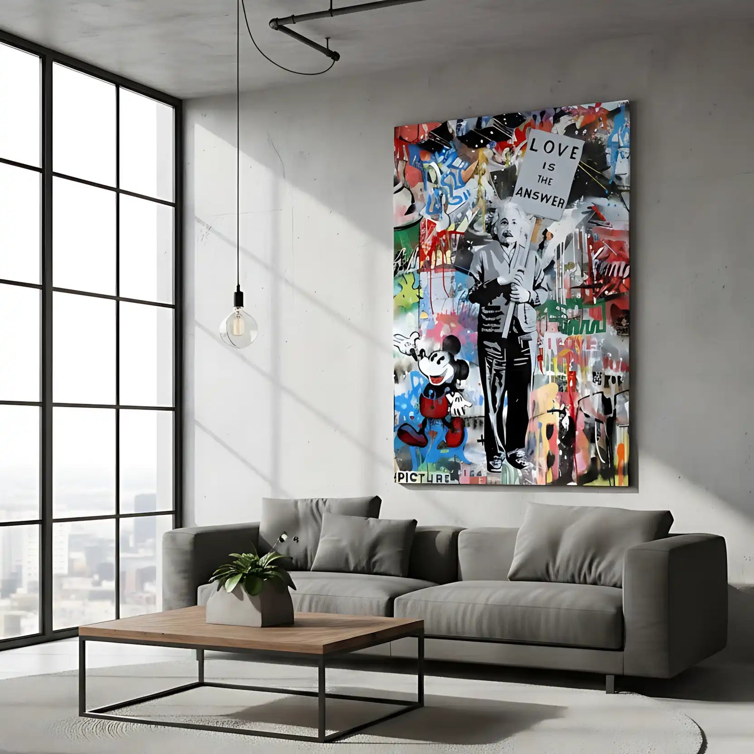 Toile pop art avec message d'amour, couleurs vives et personnages iconiques, idéale pour salon ou bureau moderne.